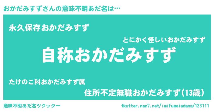 | 男性向けラノベタイトル風あだ名 | 『Re:おかだみすずから始める異世界生活』 |