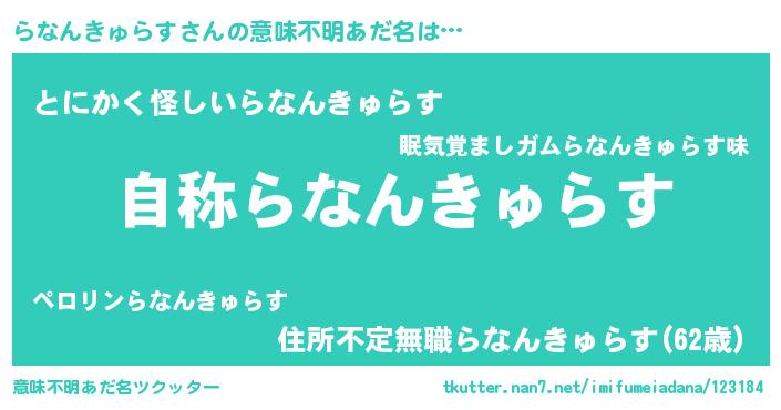 | 男性向けラノベタイトル風あだ名 | 『Re:らなんきゅらすから始める異世界生活』 |