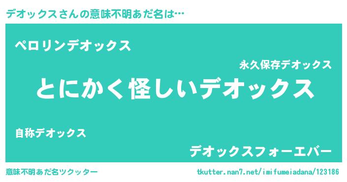 | 男性向けラノベタイトル風あだ名 | 『デオックスの嫁は女の子じゃないと思った?』 |