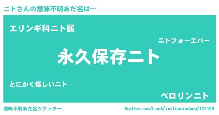| 男性向けラノベタイトル風あだ名 | 『ニトに滅ぼされるだけの簡単なお仕事です』 |