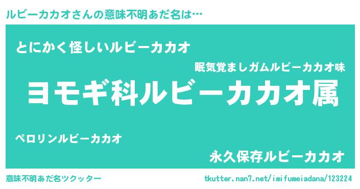 | 男性向けラノベタイトル風あだ名 | 『ルビーカカオ~年齢イコール彼女いない歴の魔法使い~』 |
