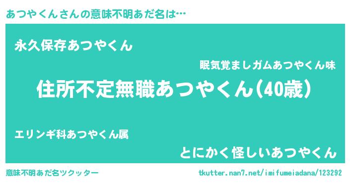 | 男性向けラノベタイトル風あだ名 | 『この素晴らしい世界にあつやくんを!』 |
