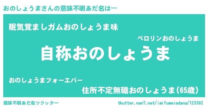 | 男性向けラノベタイトル風あだ名 | 『Re:おのしょうまから始める異世界生活』 |