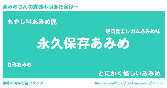| 男性向けラノベタイトル風あだ名 | 『あみめという概念が存在しない退屈な世界 』 |