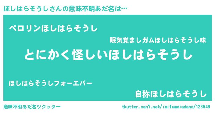 | 男性向けラノベタイトル風あだ名 | 『ほしはらそうしの嫁は女の子じゃないと思った?』 |