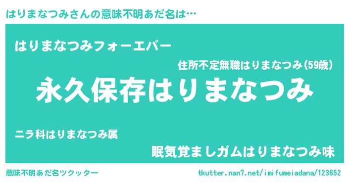 | 胡散臭い通販商品みたいなあだ名 | 『来世でも幸せになれる健康食品…その名も「はりまなつみ」』 |