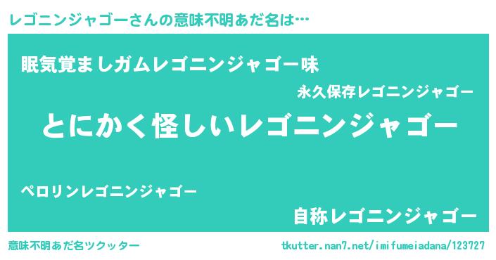| 男性向けラノベタイトル風あだ名 | 『レゴニンジャゴーの嫁は女の子じゃないと思った?』 |