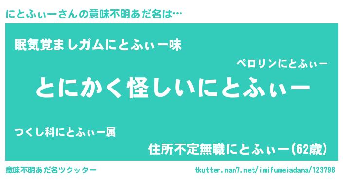 | 男性向けラノベタイトル風あだ名 | 『にとふぃーの嫁は女の子じゃないと思った?』 |