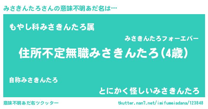 | 女子向けラノベタイトル風あだ名 | 『みさきんたろが死なない童話 林檎のみさきんたろの診療簿』 |