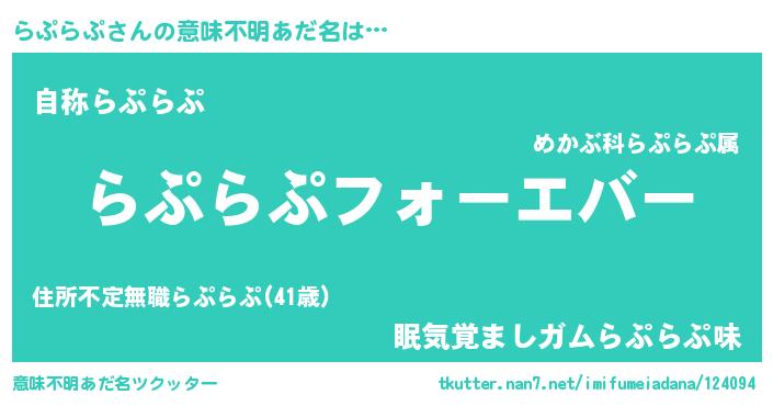 | ファンタジー風あだ名 | 『エターナルラプラプー』『ゼラプトゥ』 |