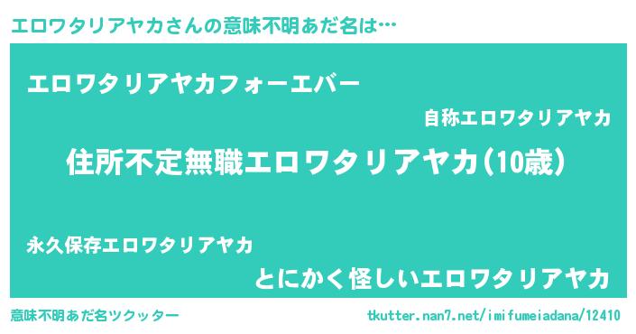 | 男性向けラノベタイトル風あだ名 | 『この素晴らしい世界にエロワタリアヤカを!』 |