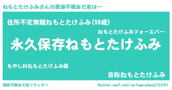| 女子向けラノベタイトル風あだ名 | 『異世界で失敗しない100のねもとたけふみ』 |