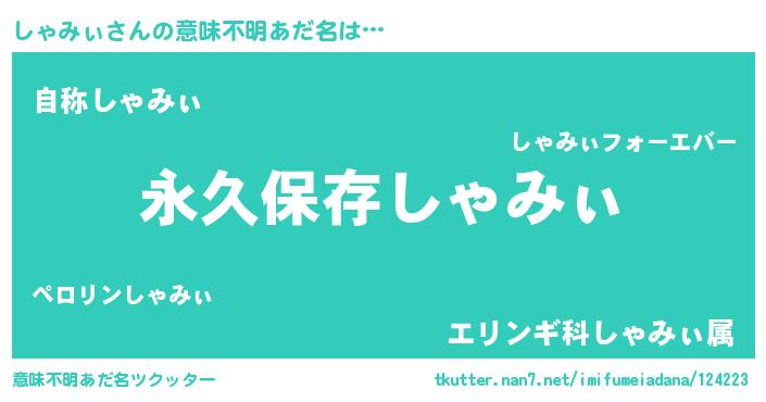 | 男性向けラノベタイトル風あだ名 | 『しゃみぃという概念が存在しない退屈な世界 』 |