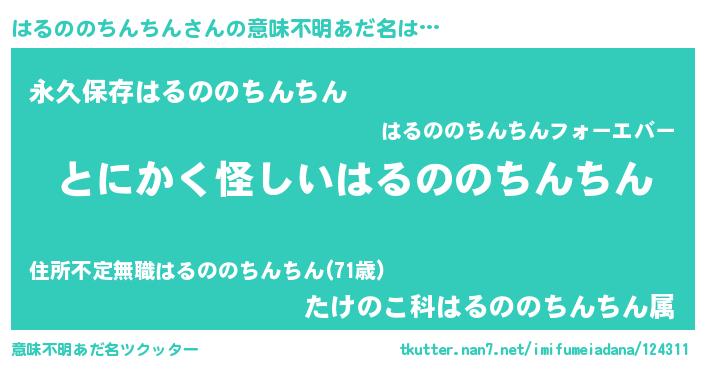 | 男性向けラノベタイトル風あだ名 | 『はるののちんちんの嫁は女の子じゃないと思った?』 |