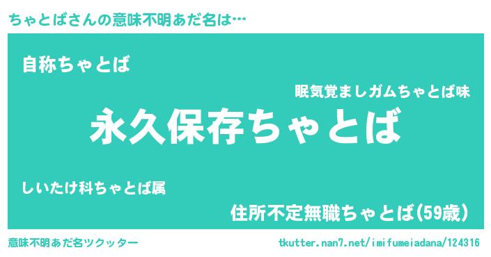 | 男性向けラノベタイトル風あだ名 | 『ちゃとばという概念が存在しない退屈な世界 』 |
