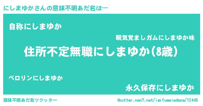 | ヘコむあだ名 | 『にしまゆか(笑)』『にしにゅー』 |
