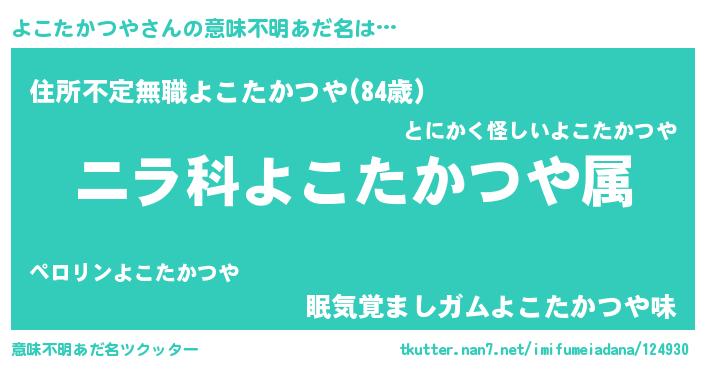 | 男性向けラノベタイトル風あだ名 | 『よこたかつや~年齢イコール彼女いない歴の魔法使い~』 |