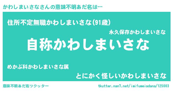 | 男性向けラノベタイトル風あだ名 | 『Re:かわしまいさなから始める異世界生活』 |