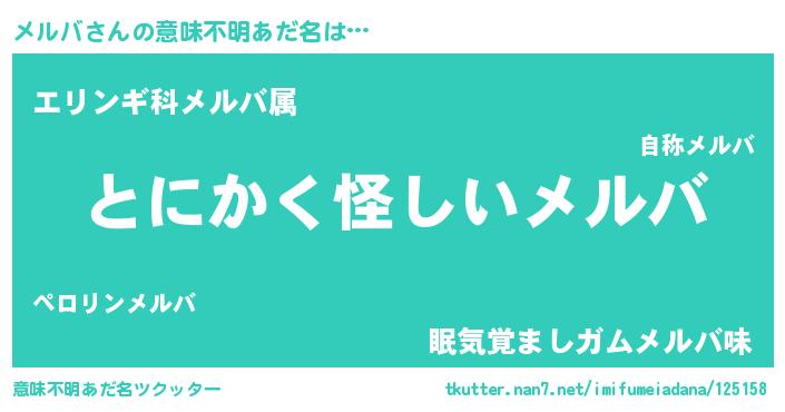 男性向けラノベタイトル風あだ名 | 『メルバの嫁は女の子じゃないと思った?』 |