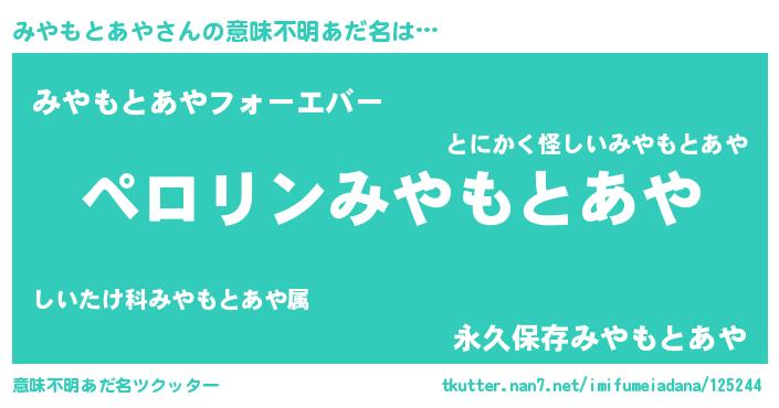 | 男性向けラノベタイトル風あだ名 | 『ミヤモトアヤアートオンライン』 |