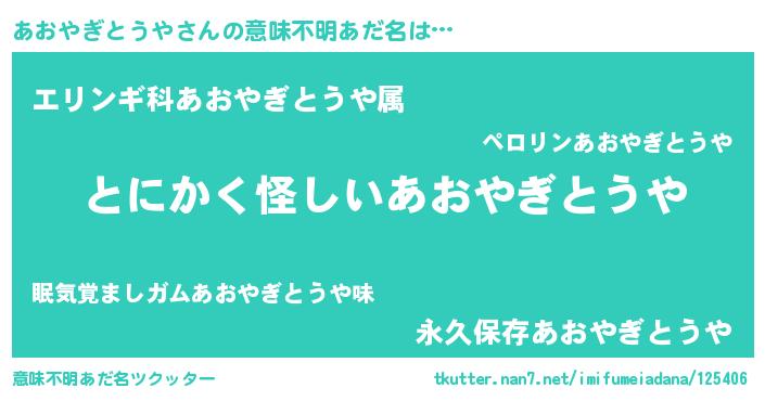 | 女子向けラノベタイトル風あだ名 | 『あおやぎとうや様がみてる』 |