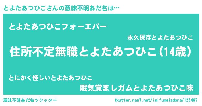 | ヘコむあだ名 | 『酢こんぶ』『とよたあつひこ(笑)』 |