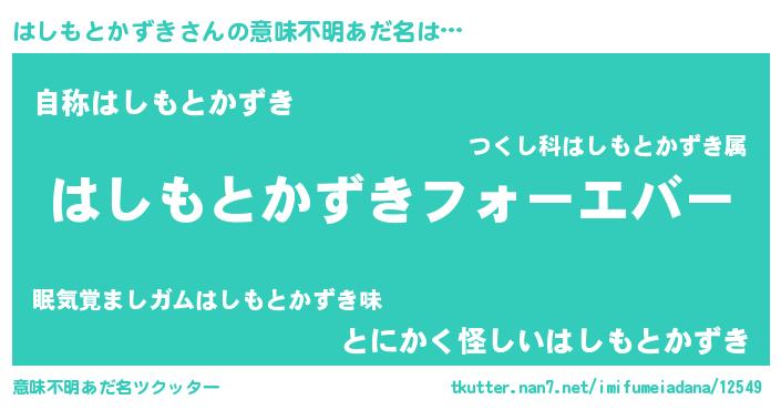 | 女子向けラノベタイトル風あだ名 | 『はしもとかずきの雑貨屋さん』 |