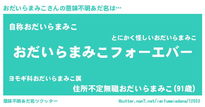 | 男性向けラノベタイトル風あだ名 | 『うちの娘の為ならば、俺はもしかしたらおだいらまみこも倒せるかもしれない。』 |