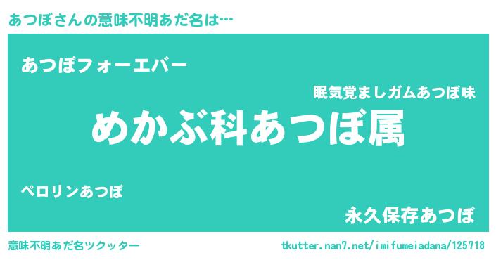 | ヒーロー風カッコイイあだ名 | 『ウルトラあつぼマン』『ネオアツボ』 |