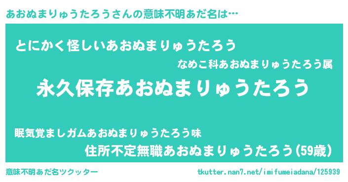 | 男性向けラノベタイトル風あだ名 | 『あおぬまりゅうたろうという概念が存在しない退屈な世界 』 |