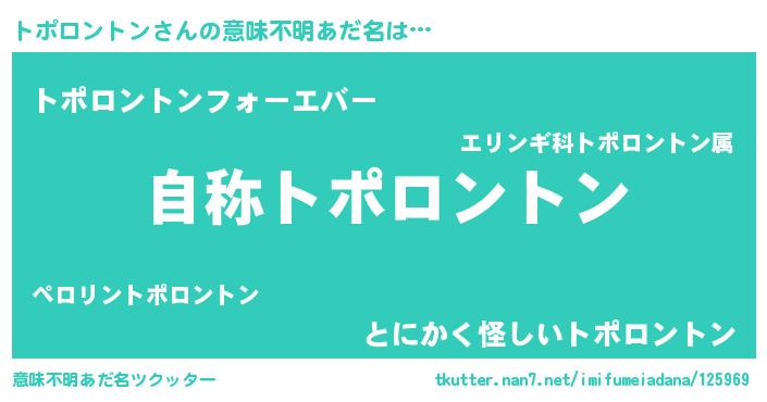 | 男性向けラノベタイトル風あだ名 | 『Re:トポロントンから始める異世界生活』 |