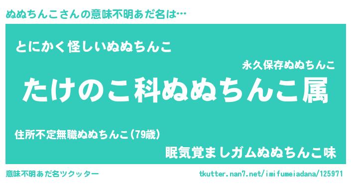 | 男性向けラノベタイトル風あだ名 | 『転生したらぬぬちんこだった件』 |