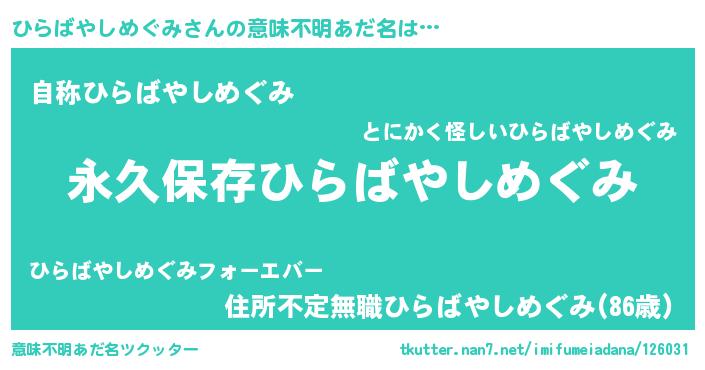| ヘコむあだ名 | 『ひらばやしめぐみ(笑)』『ひらを』 |