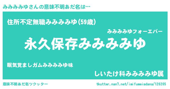 | 男性向けラノベタイトル風あだ名 | 『みみみみゆという概念が存在しない退屈な世界 』 |