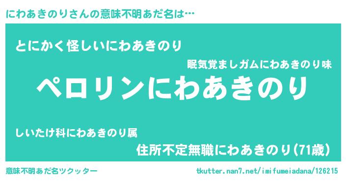 | 女子向けラノベタイトル風あだ名 | 『誰かこのにわあきのりを説明してください! ~契約から始まるウェディング~』 |