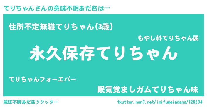 | 女子向けラノベタイトル風あだ名 | 『異世界で失敗しない100のてりちゃん』 |