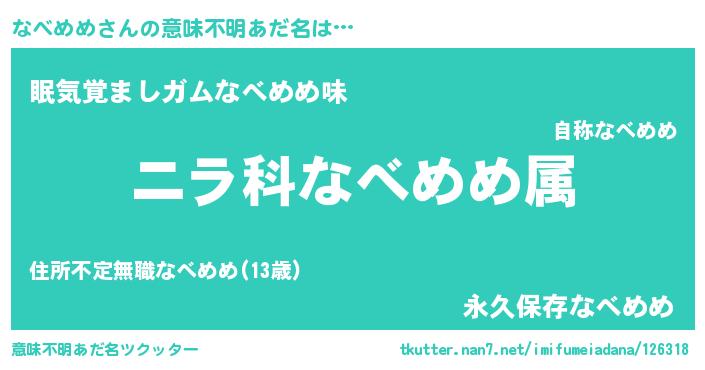 | ヒーロー風カッコイイあだ名 | 『慈愛の使者なべめめ』『ネオナベメメ』 |