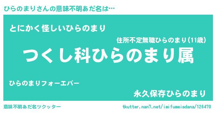 | 男性向けラノベタイトル風あだ名 | 『ひらのまり~年齢イコール彼女いない歴の魔法使い~』 |