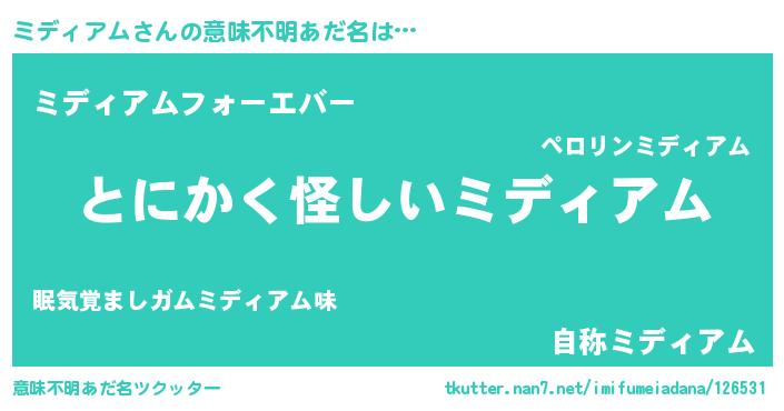 | 男性向けラノベタイトル風あだ名 | 『ミディアムの嫁は女の子じゃないと思った?』 |