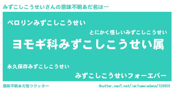 | 男性向けラノベタイトル風あだ名 | 『みずこしこうせい~年齢イコール彼女いない歴の魔法使い~』 |