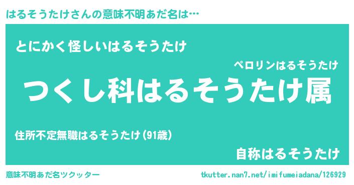 | 女子向けラノベタイトル風あだ名 | 『はるそうたけの玉の輿計画!』 |