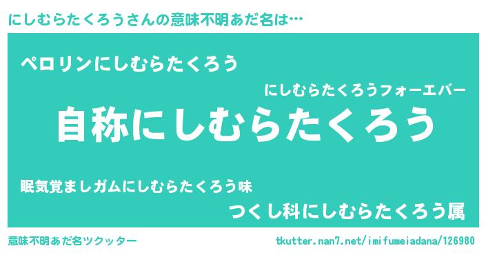 | 肩書あだ名 | 『にしむらたくろう閣下』 |