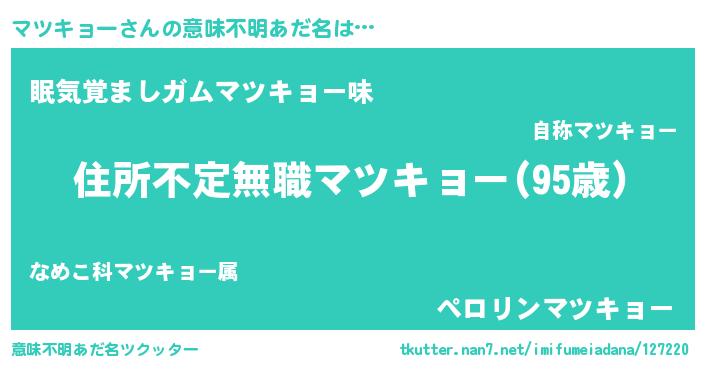 | 女子向けラノベタイトル風あだ名 | 『乙女ゲームの破滅フラグしかない悪役マツキョーに転生してしまった…』 |