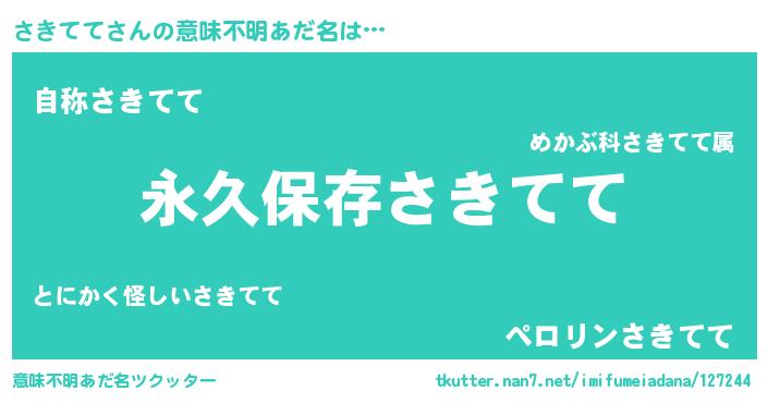 | 男性向けラノベタイトル風あだ名 | 『さきててという概念が存在しない退屈な世界 』 |