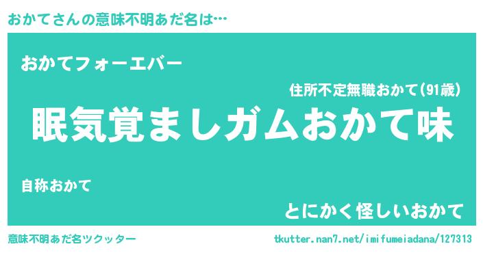 | 女子向けラノベタイトル風あだ名 | 『死神おかての再婚』『おかて様がみてる』 |