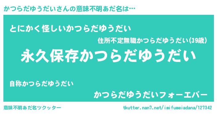 | 胡散臭い通販商品みたいなあだ名 | 『絶対に幸福をもたらす健康食品…その名も「かつらだゆうだい」』 |