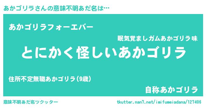 | 男性向けラノベタイトル風あだ名 | 『あかゴリラの嫁は女の子じゃないと思った?』 |