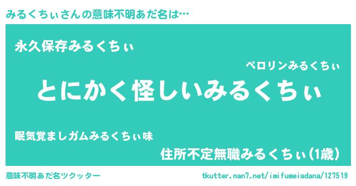 | 男性向けラノベタイトル風あだ名 | 『うちのみるくちぃが世界を掌握している!』 |