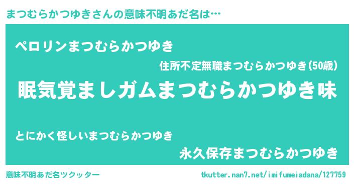 | 男性向けラノベタイトル風あだ名 | 『おまえをオタクにしてやるから、俺をまつむらかつゆきにしてくれ! 』 |