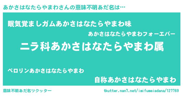 | 男性向けラノベタイトル風あだ名 | 『あかさはなたらやまわ~年齢イコール彼女いない歴の魔法使い~』 |